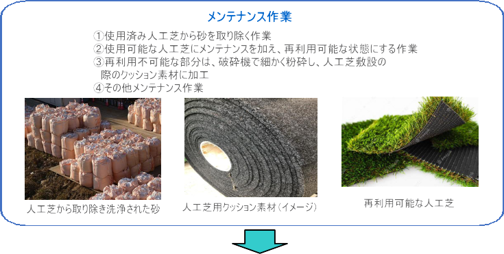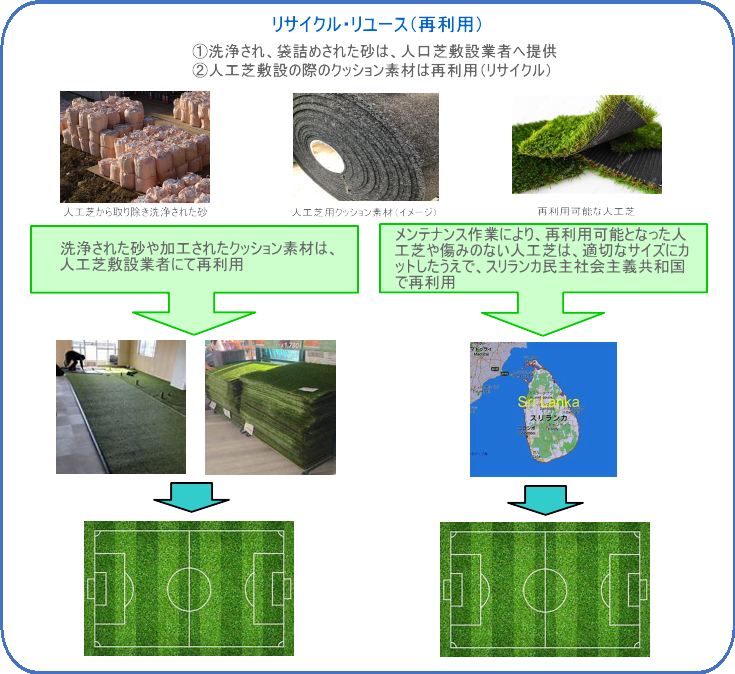 まだ使用可能である状態で張り替えが行われています。そのため、学校や各種クラブなど人工芝フィールドが欲しい団体へ、中古の人工芝を提供することがありますが、うまく活用する事が出来ず、実際には処分されてしまっている場合がほとんどです。